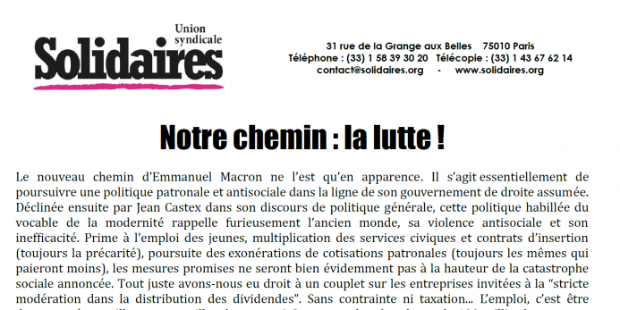 La construction du rapport de force dans le monde du travail et dans la rue est donc pour Solidaires le chemin tracé. Ni nouveau ni ancien, comme toujours juste indispensable.