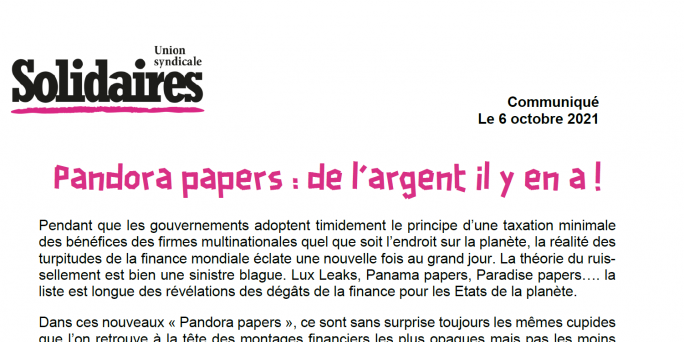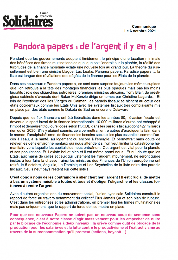 Depuis que les flux financiers ont été libéralisés dans les années 80, l’évasion fiscale est devenue le sport favori de la finance internationale. 10 000 milliards d’euros ont échappé à l’impôt et demeurent toujours logés selon l’OCDE dans les paradis fiscaux dont 427 milliards rien qu’en 2020. S’ils y étaient soumis, cela permettrait entre autres d’éradiquer la faim dans le monde, l’analphabétisme, de financer les besoins sociaux les plus essentiels comme l’accès à l’eau, à la santé, au logement ou encore à l’énergie. Et permettrait sans doute de relever les défis environnementaux qui nous attendent si l’on veut limiter la catastrophe humanitaire vers laquelle les capitalistes nous entraînent. Cet argent est vital pour la planète et ses populations. Et il existe bel et bien et il est même parmi nous ! Et nul doute que les Etats, aux mains de celles et ceux qui justement les fraudent impunément, ne seront guère incités à leur faire la chasse : ainsi les ministres des Finances de l’Union européenne ont retiré, le 5 octobre, Anguilla, La Dominique et Les Seychelles de la liste noire des paradis fiscaux. Seuls neuf pays restent sur cette liste !