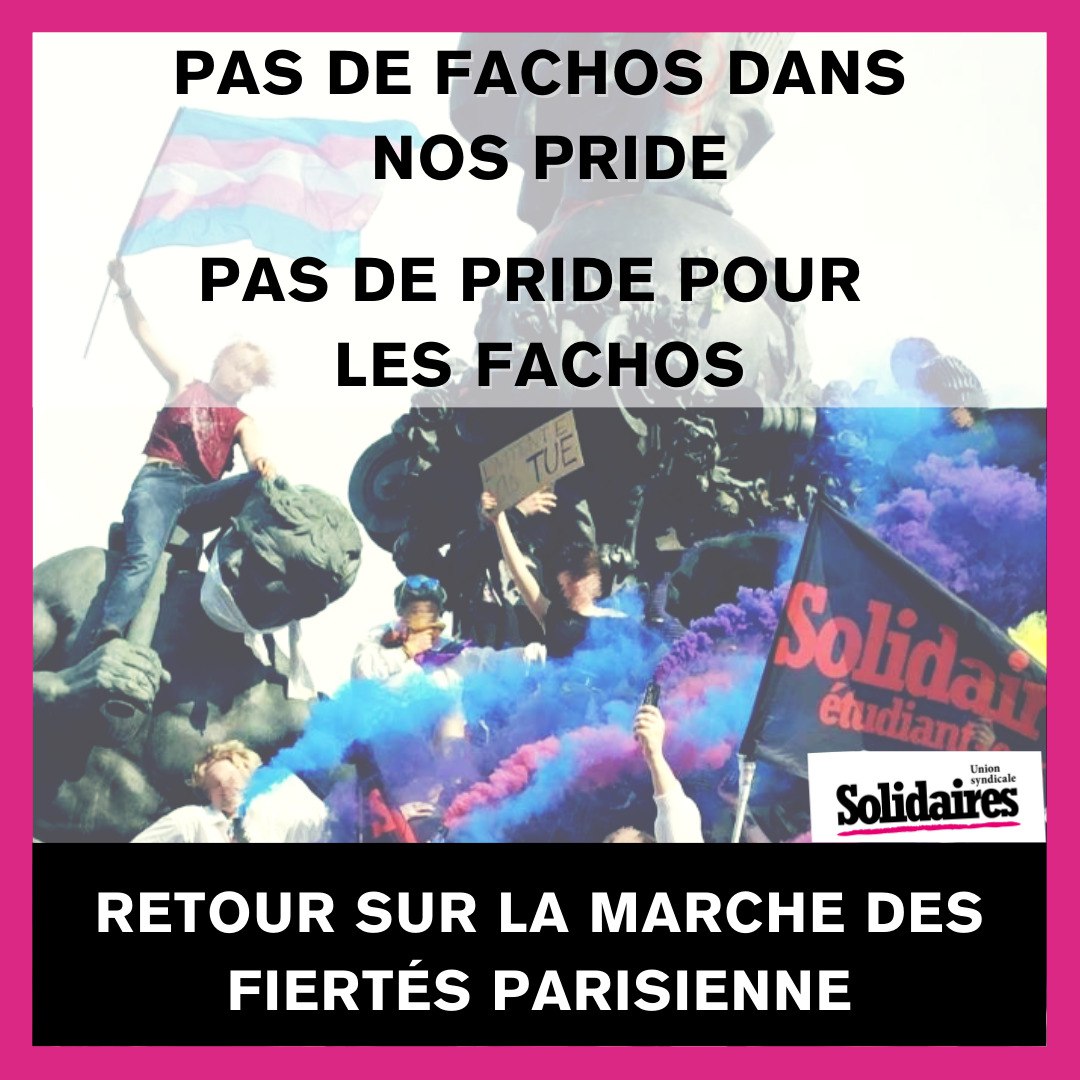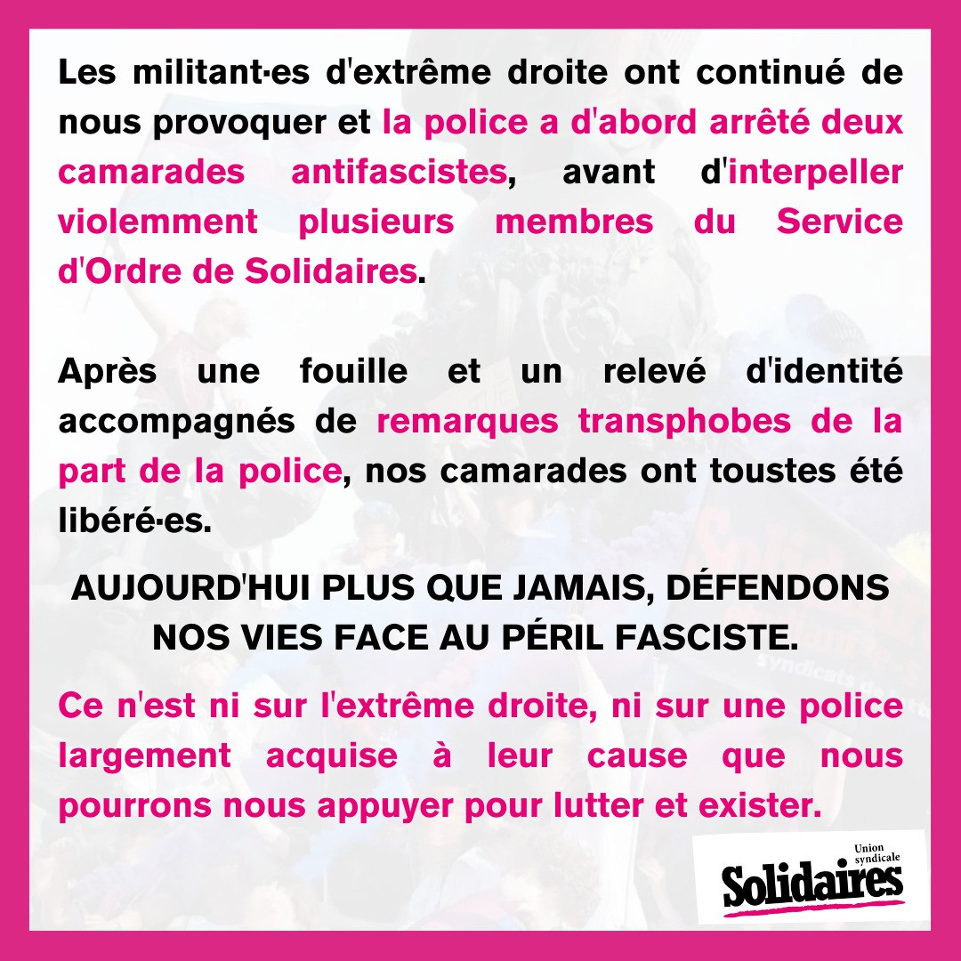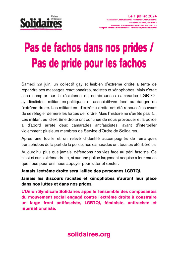 Samedi 29 juin, un collectif gay et lesbien d'extrême droite a tenté de répandre ses messages réactionnaires, racistes et xénophobes. Mais c'était sans compter sur la résistance de nombreux∙ses camarades LGBTQI, syndicalistes, militant×es politiques et associatif∙ves face au danger de l'extrême droite. Les militant×es d'extrême droite ont été repoussé·es avant de se réfugier derrière les forces de l'ordre. Mais l'histoire ne s'arrête pas là... Les militant×es d'extrême droite ont continué de nous provoquer et la police a d'abord arrêté deux camarades antifascistes, avant d'interpeller violemment plusieurs membres de Service d'Ordre de Solidaires.