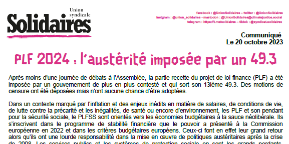 Dans un contexte marqué par l’inflation et des enjeux inédits en matière de salaires, de conditions de vie, de lutte contre la précarité et les inégalités, de santé ou encore d’environnement, les PLF et son pendant pour la sécurité sociale, le PLFSS sont orientés vers les économies budgétaires à la sauce néolibérale. Ils s’inscrivent dans le programme de stabilité financière que le pouvoir a présenté à la Commission européenne en 2022 et dans les critères budgétaires européens. Ceux-ci font en effet leur grand retour alors qu’ils ont une lourde responsabilité dans la mise en œuvre de politiques austéritaires après la crise de 2008. Les services publics et les systèmes de protection sociale en sont les grands perdants. L’immense majorité de la population continuera donc de subir des choix injustes (lire notre CP sur le PLFSS).