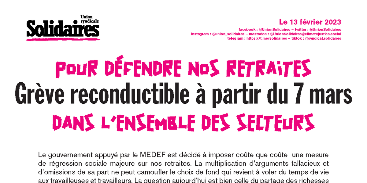 Réuni·es en comité national extraordinaire le lundi 13 février 2023, nous considérons que nous pouvons gagner la bataille des retraites. Pour cela, nous devons augmenter le rapport de force pour contraindre le gouvernement, qui persiste dans sa position ultra-minoritaire, à retirer ce projet de loi. il doit le retirer le plus vite possible. Dans le cas contraire, nous nous engagerons dans un durcissement de la mobilisation.