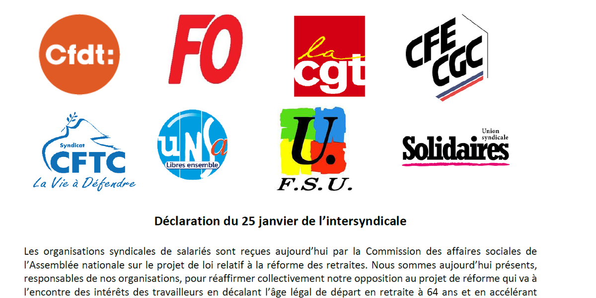 Nous sommes aujourd’hui présents, responsables de nos organisations, pour réaffirmer collectivement notre opposition au projet de réforme qui va à l’encontre des intérêts des travailleurs en décalant l’âge légal de départ en retraite à 64 ans et en accélérant l’allongement de la durée de cotisation.