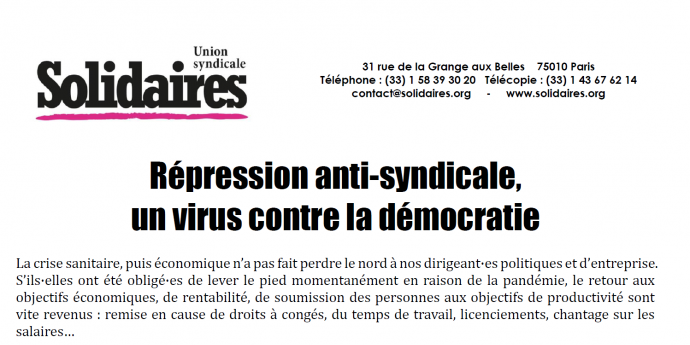 La parole dissidente est traquée et réprimée jusque dans l’illégalité : intolérable, inadmissible, l’union syndicale Solidaires exige que la répression antisociale cesse immédiatement ! Partout, dans les lieux de travail et les espaces publics, actionnons les outils à notre disposition notamment les outils judiciaires, informons, créons les soutiens nécessaires. Et construisons les rapports de force pour faire plier le gouvernement et le capitalisme :