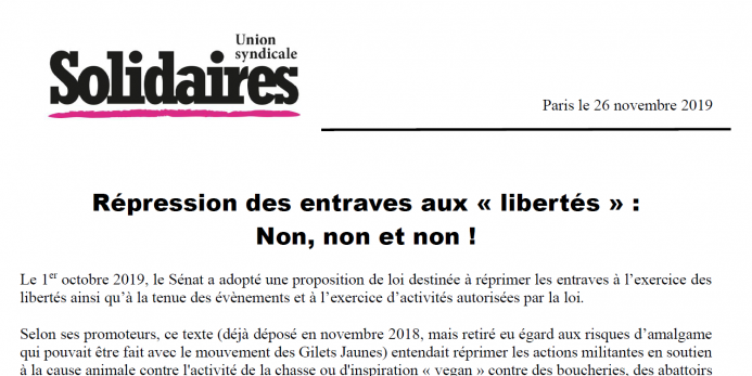 Outre qu'il concourt à une inflation textuelle car des faits repris dans l’exposé des motifs entrent dans le champ d'autres textes répressifs, il est un souci majeur. En effet, il s’agit une fois de plus d’empêcher les luttes et l'expression des revendications en judiciarisant des actes et expressions militants. Au motif de protéger certains intérêts particuliers comme le lobby de la chasse, il ouvre la porte à la pénalisation des actions revendicatives telles que piquets de grève, blocus, action BDS... ce qui ne déplairait certainement pas au gouvernement. L'exemple du retour de la loi anticasseurs sous les traits de la loi anti-manifs du 10 avril dernier est suffisamment là pour nous alerter.