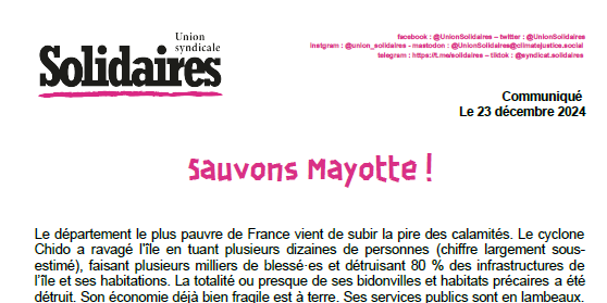 Pour aider la population de Mayotte des cagnottes ont été mises en place par les organisations syndicales. Aidons Mayotte à revivre : ttps://www.helloasso.com/associations/sud-ptt/formulaires/4