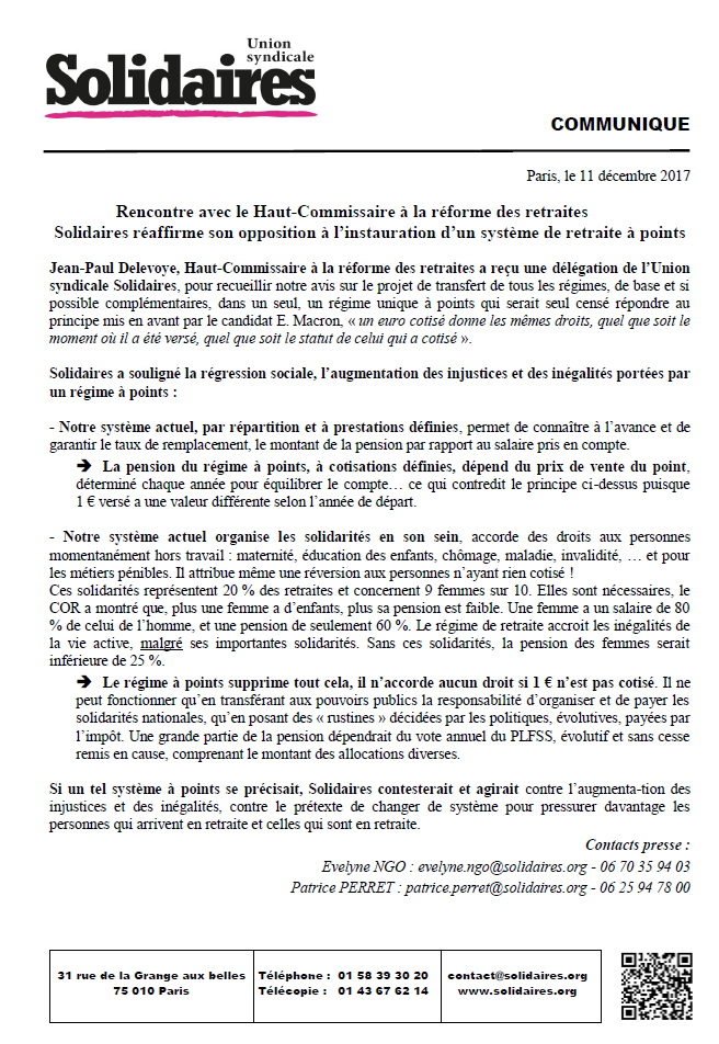 Solidaires réaffirme son opposition à l’instauration d’un système de retraite à points