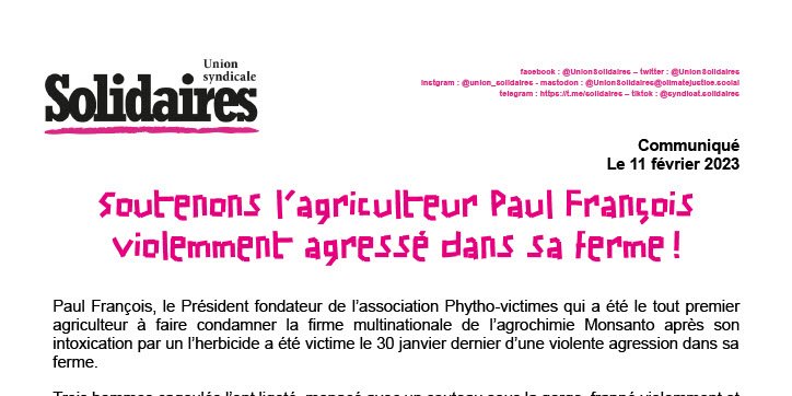 L’Union syndicale Solidaires condamne avec force la violente et intolérable agression dont Paul François a été la victime. Ses agresseurs et les éventuels commanditaires de son agression doivent être recherchés activement, retrouvés et poursuivis devant la justice.