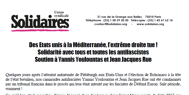 Quelques jours après l’attentat antisémite de Pittsburgh aux Etats-Unis et l’élection de Bolsonaro à la tête de l’état brésilien, nos camarades antifascistes Yannis Youlountas et Jean Jacques Rue ont été condamnés par un tribunal français dans le procès qui leur était intenté par les fascistes de Défend Europ.