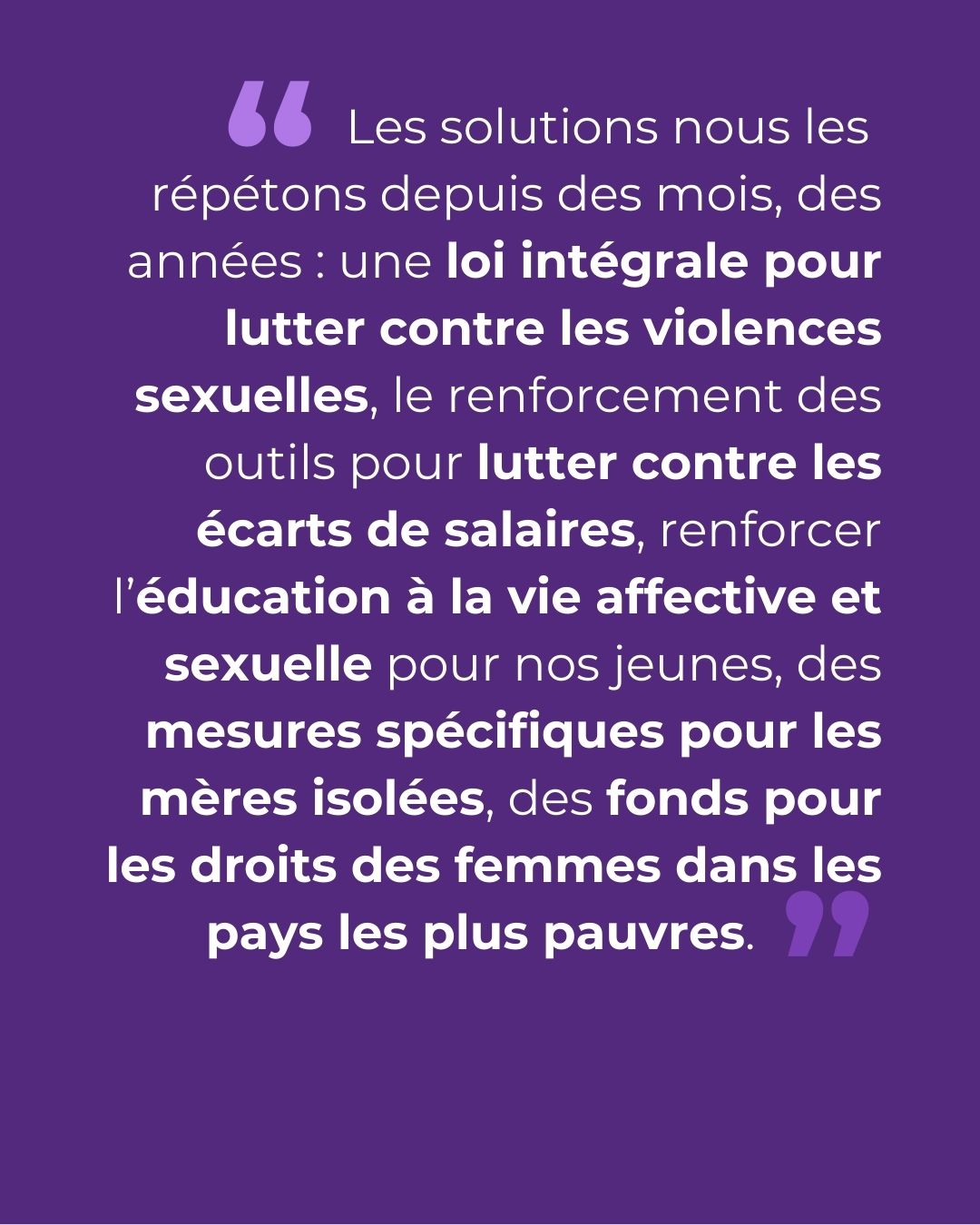 Nous le devons aux 12 générations de femmes et de filles qui ne connaîtront pas un monde égalitaire. Pour Gisèle Pelicot, dont le combat doit continuer à nous inspirer. Pour les 93 femmes tuées par leur conjoint ou ex l’année dernière en France. Pour Mahsa Jîna Amini, dont le combat pour les femmes, la vie et la liberté résonne encore. Pour les personnes LGBTQIA+, en particulier les personnes transgenres, qui sont de plus en plus attaquées. Pour les femmes afghanes à qui on veut enlever la voix. Pour les femmes congolaises dont le corps est utilisé comme une arme de guerre. Pour toutes les femmes qui travaillent pour gagner moins que les hommes et qui font plus à la maison. Pour toutes celles qui perdent la vie en la donnant faute de soins de qualité. Pour les millions de femmes qui vivent dans un pays où l’avortement n’est pas ou plus libre, comme aux Etats-Unis. Pour toutes les femmes défenseures des droits et de nos libertés fondamentales qui sont plus que jamais menacées.