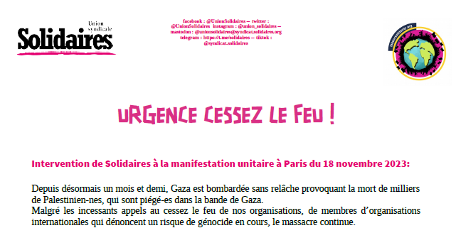Intervention de Solidaires à la manifestation unitaire à Paris du 18 novembre 2023 :