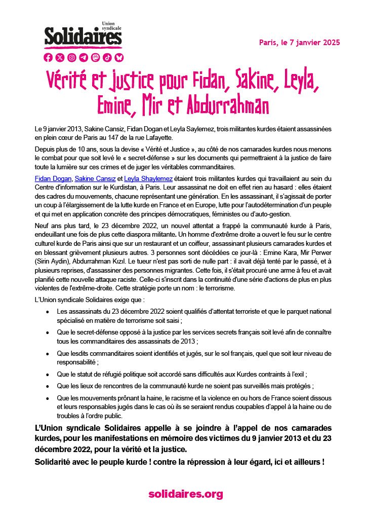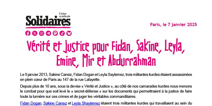 Plus d'info : https://kurdistan-au-feminin.fr/2025/01/09/il-y-a-douze-ans-on-assassinait-trois-militantes-kurdes-a-paris/