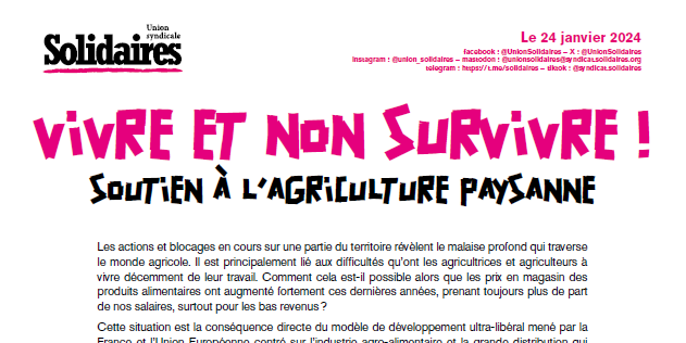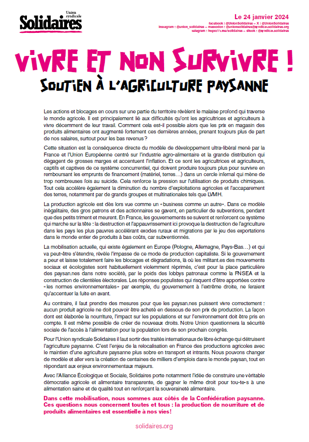 Pour l’Union syndicale Solidaires il faut sortir des traités internationaux de libre échange qui détruisent l’agriculture paysanne. C’est l’enjeu de la relocalisation en France des productions agricoles avec le maintien d’une agriculture paysanne plus sobre en transport et intrants. Nous pouvons changer de modèle et aller vers la création de centaines de milliers d'emplois dans le monde paysan, tout en répondant aux enjeux environnementaux majeurs.