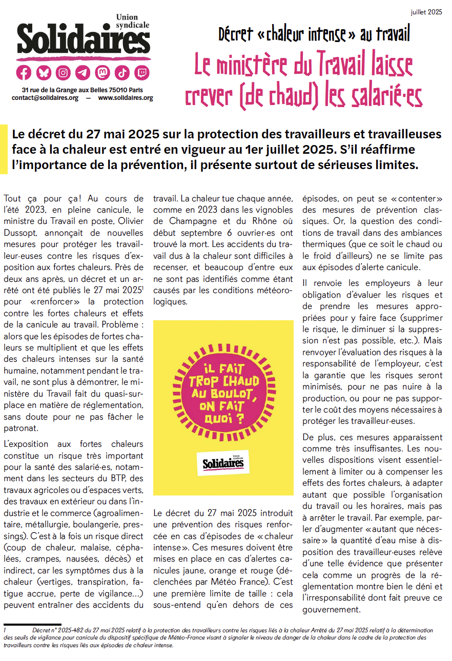 Le décret du 27 mai 2025 sur la protection des travailleurs et travailleuses face à la chaleur est entré en vigueur au 1er juillet 2025. S’il réaffirme l’importance de la prévention, il présente surtout de sérieuses limites.