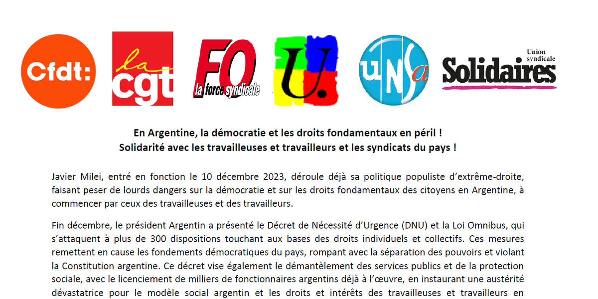 Nos organisations syndicales CFDT, CGT, FO, FSU, UNSA et Solidaires expriment leur plus vive inquiétude face à cette offensive contre les acquis de plusieurs décennies de luttes sociales et syndicales en Argentine.