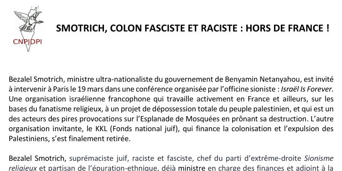 Nous demandons au gouvernement français de confirmer qu’il n’aura aucun contact, à quelque niveau que ce soit, avec ce dangereux personnage. La France doit dire officiellement à Smotrich qu’il est persona non grata dans notre pays, et le faire savoir publiquement.
