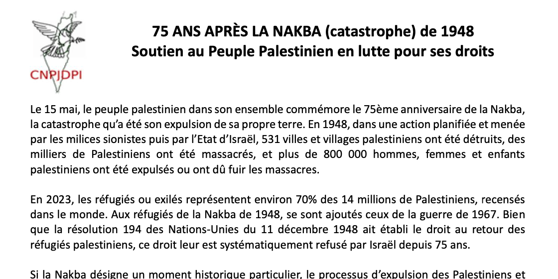 Autour de cette date du 15 mai marquant les 75 ans de la Nakba, le Collectif national appelle à des mobilisations dans toute la France.