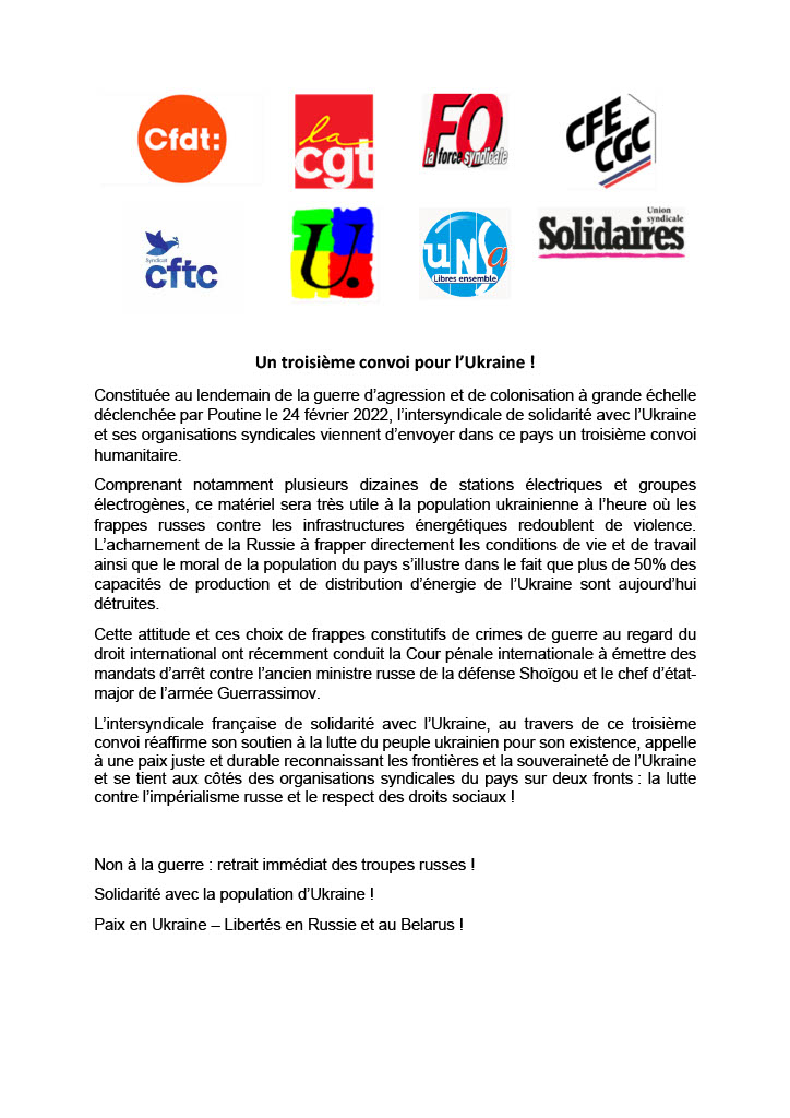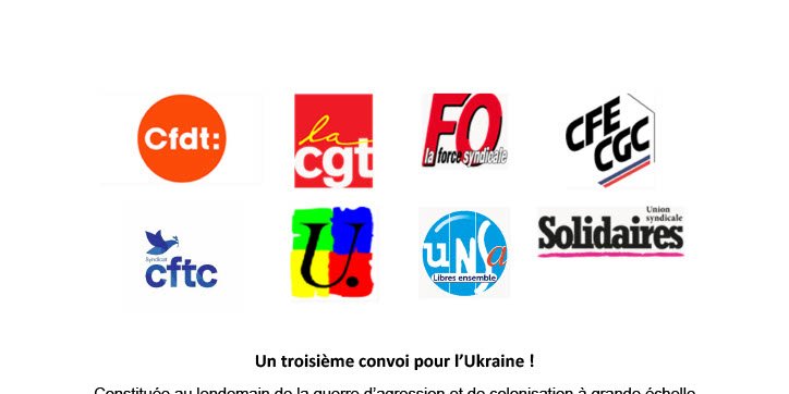 L’intersyndicale française de solidarité avec l’Ukraine, au travers de ce troisième convoi réaffirme son soutien à la lutte du peuple ukrainien pour son existence, appelle à une paix juste et durable reconnaissant les frontières et la souveraineté de l’Ukraine et se tient aux côtés des organisations syndicales du pays sur deux fronts : la lutte contre l’impérialisme russe et le respect des droits sociaux !