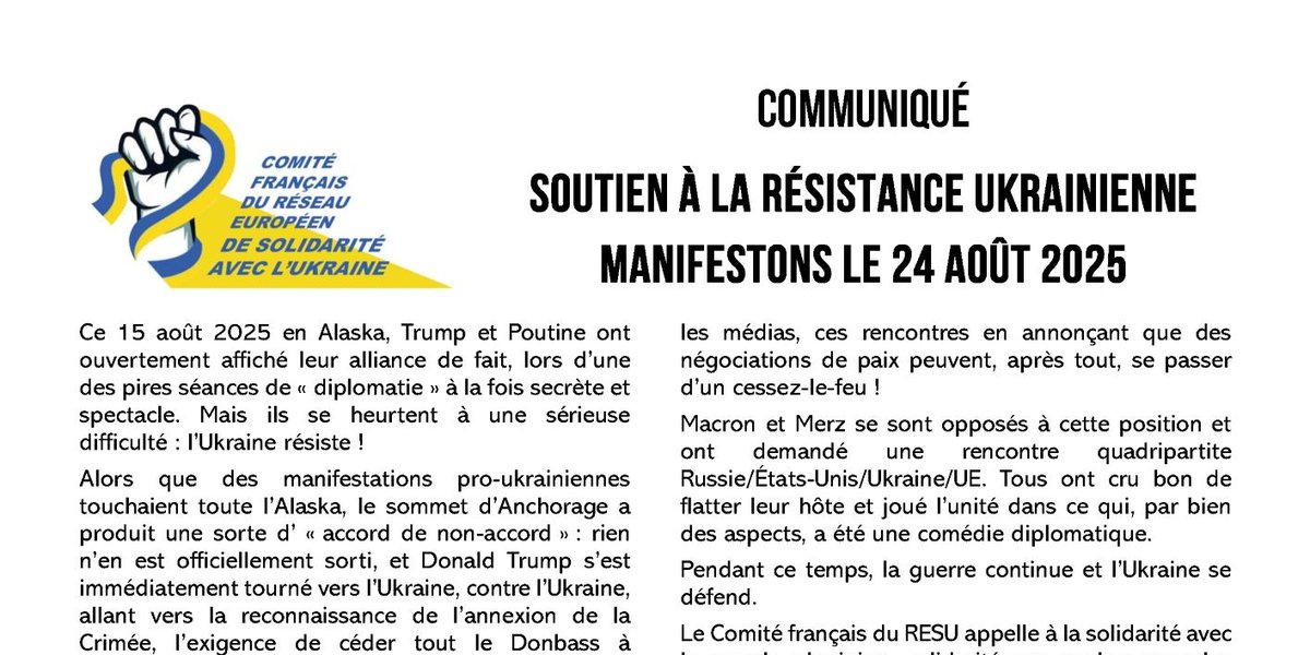 Dimanche 24 août 2025, manifestons dans toute la france avec les associations ukrainiennes pour la journée de l’indépendance et en soutien à la résistance ukrainienne.