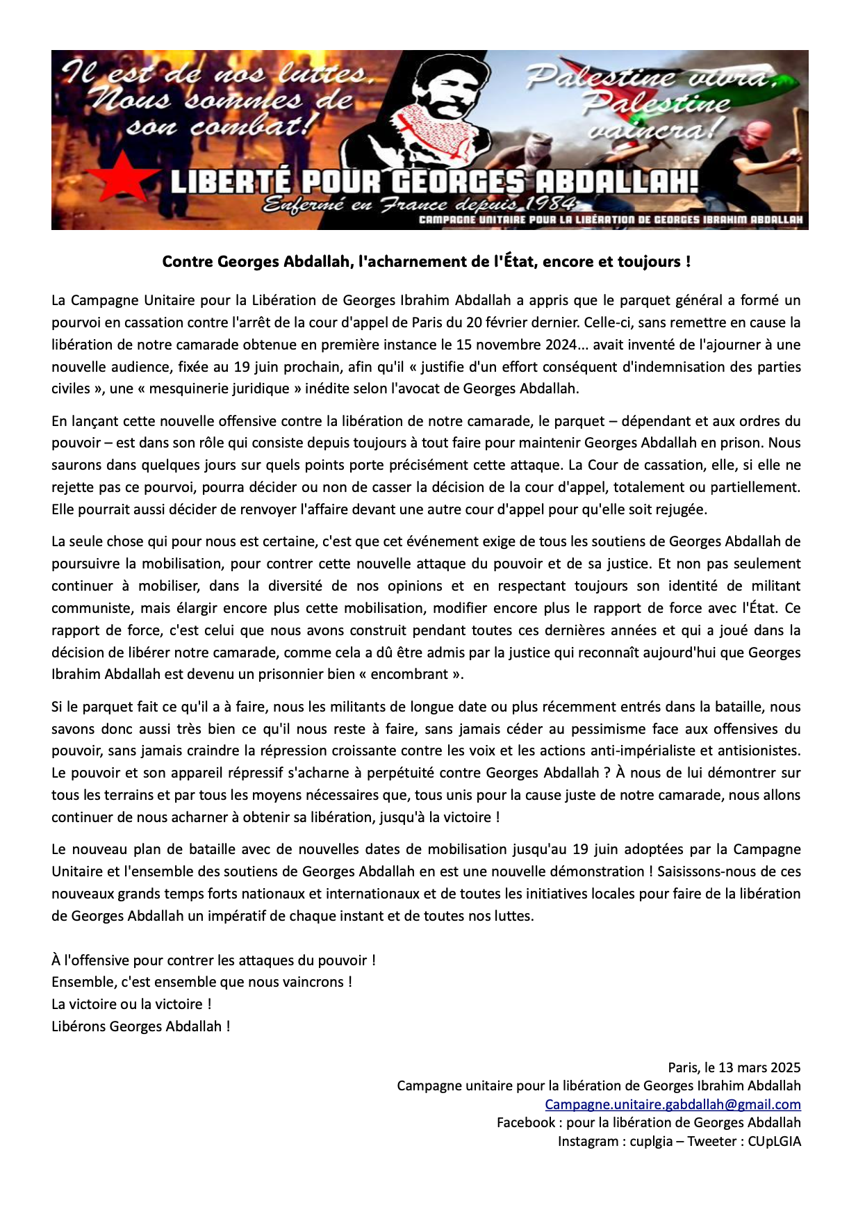 La Campagne Unitaire pour la Libération de Georges Ibrahim Abdallah a appris que le parquet général a formé un pourvoi en cassation contre l'arrêt de la cour d'appel de Paris du 20 février dernier. Celle-ci, sans remettre en cause la libération de notre camarade obtenue en première instance le 15 novembre 2024... avait inventé de l'ajourner à une nouvelle audience, fixée au 19 juin prochain, afin qu'il « justifie d'un effort conséquent d'indemnisation des parties civiles », une « mesquinerie juridique » inédite selon l'avocat de Georges Abdallah.
