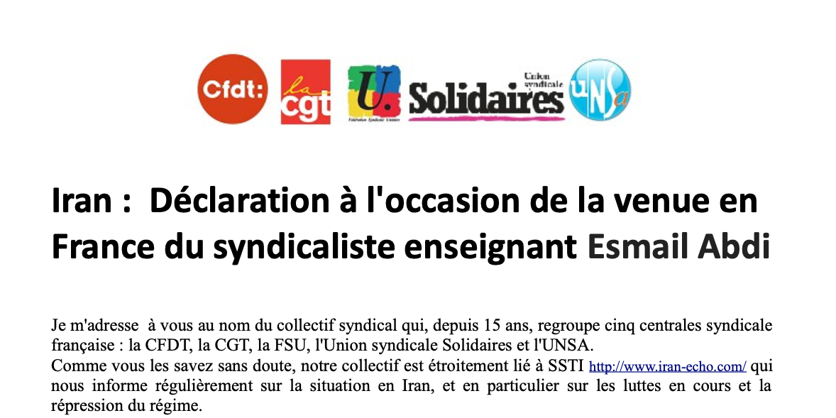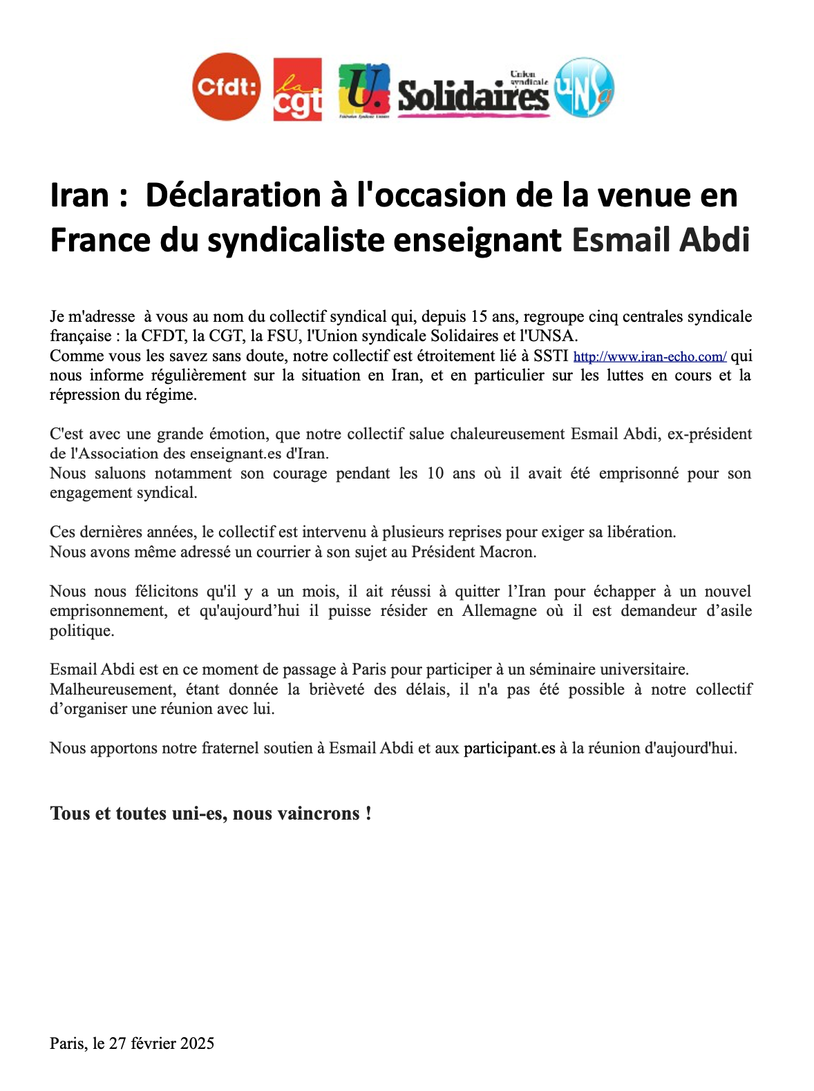 Nous apportons notre fraternel soutien à Esmail Abdi et aux participant·es à la réunion d'aujourd'hui.