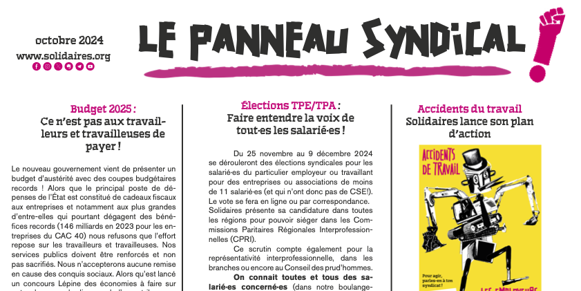 - Du 25 novembre au 9 décembre 2024 se dérouleront des élections syndicales pour les salarié·es du particulier employeur ou travaillant pour des entreprises ou associations de moins de 11 salarié·es (et qui n’ont donc pas de CSE!). Le vote se fera en ligne ou par correspondance.