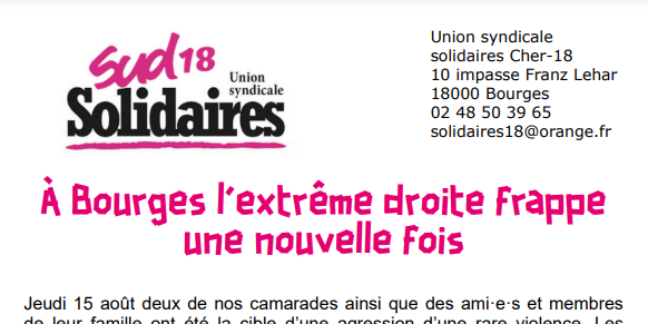 Nous serons particulièrement vigilant·es sur les suites que le procureur de la République donnera aux plaintes qui ont été et qui seront déposées. Solidaires Cher apporte son soutien aux camarades agressé·e·s car militant·e·s syndicalistes et antifascistes. Nous réaffirmons notre opposition totale à l’extrême droite et notre engagement plein et entier dans la lutte contre ses idées. Nous ne céderons ni aux menaces, ni aux intimidations, ni aux violences. Notre détermination est intacte