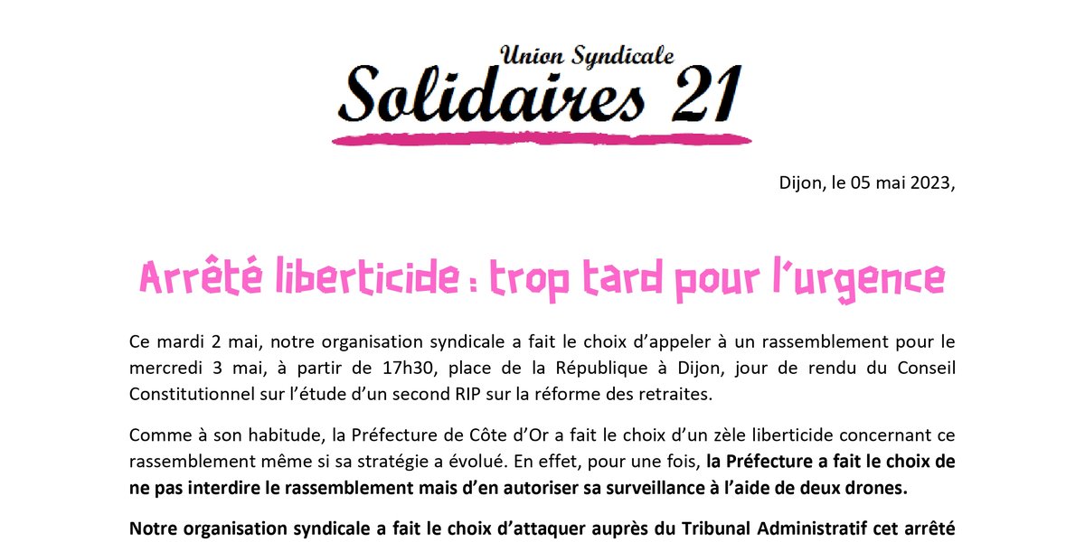 Ce mardi 2 mai, notre organisation syndicale a fait le choix d’appeler à un rassemblement pour le mercredi 3 mai, à partir de 17h30, place de la République à Dijon, jour de rendu du Conseil Constitutionnel sur l’étude d’un second RIP sur la réforme des retraites.