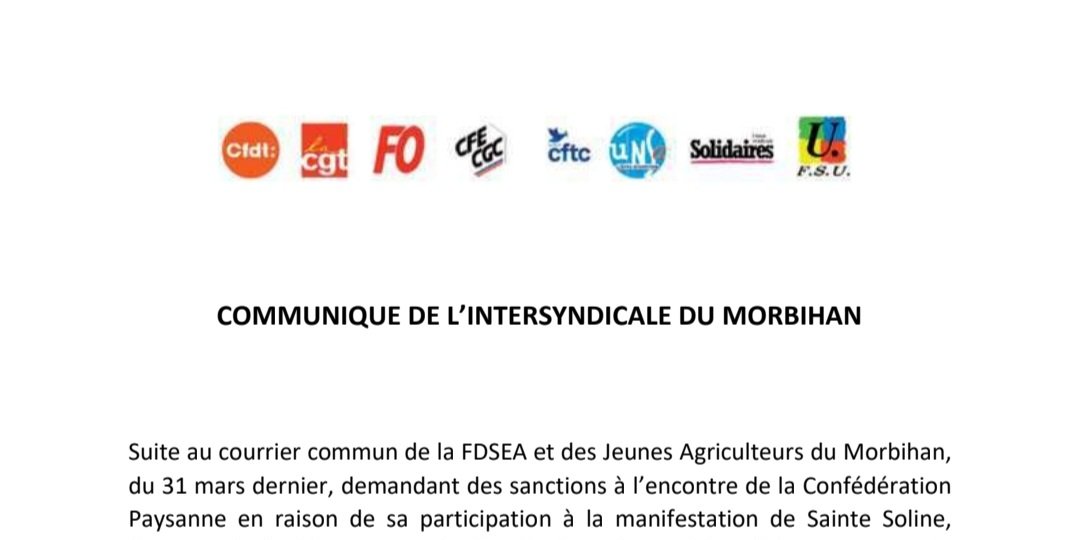 Communiqué de l'intersyndicale du Morbihan suite au courrier de la FDSEA et des JA contre nos camarades de la Confédération Paysanne