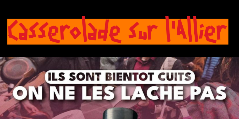 Le Lundi 24 Avril nous pouvons encore hausser le ton. C'est tout le sens de la casserolade générale partout où il est possible d'en organiser en France. Sur l'Allier plusieurs villes répondront présent à cet appel. Déjà annoncé : Commentry, Montluçon, Moulins et Vichy. Alors toutes et tous avec nos casseroles pour montrer que nous ne lâchons rien !