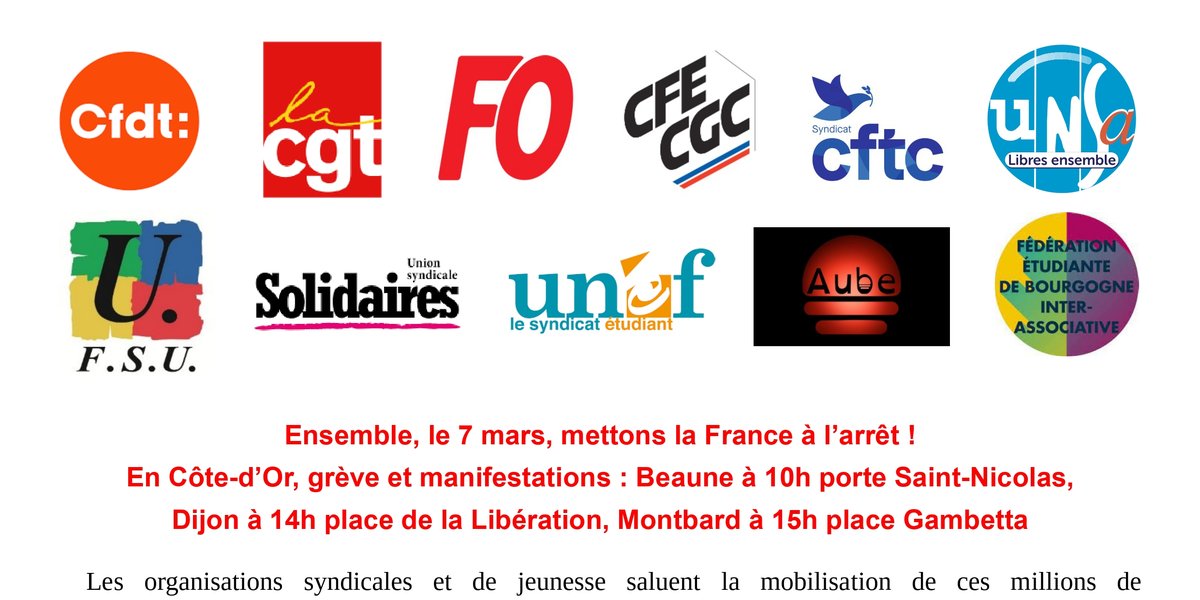 Les organisations syndicales professionnelles et de jeunesse continuent leurs actions d’information et de conviction pour élargir encore le mouvement social. Le 7 mars doit être une véritable journée morte dans les entreprises, les administrations, les services, les commerces, les écoles, les lieux d’études, les transports… Pour y parvenir, elles organisent partout régulièrement de nombreuses initiatives publiques sur les lieux de vie et appellent la population à y participer.
