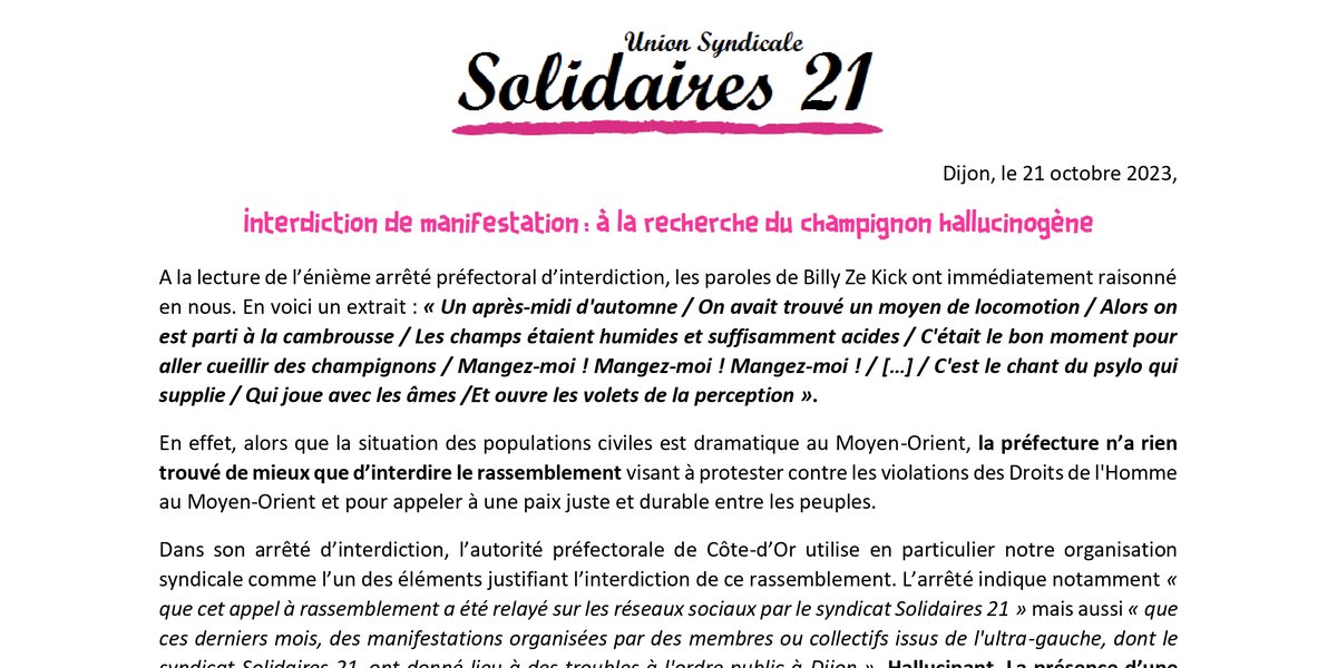 Dans son arrêté d’interdiction, l’autorité préfectorale de Côte-d’Or utilise en particulier notre organisation syndicale comme l’un des éléments justifiant l’interdiction de ce rassemblement. L’arrêté indique notamment « que cet appel à rassemblement a été relayé sur les réseaux sociaux par le syndicat Solidaires 21 » mais aussi « que ces derniers mois, des manifestations organisées par des membres ou collectifs issus de l'ultra-gauche, dont le syndicat Solidaires 21, ont donné lieu à des troubles à l'ordre public à Dijon ». Hallucinant. La présence d’une organisation syndicale lors d’une manifestation ou d’un rassemblement devient aujourd’hui un argument pour interdire ledit événement. Aux yeux des Renseignements Territoriaux, l’Union Syndicale Solidaires 21 est-elle en train de devenir le visible du Comité ? Comme le dit la chanson, « les volets de la perception » sont très ouverts. Le délire très grand.