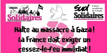 ● Le 12 octobre, après l’attaque du Hamas, L’Union syndicale Solidaires au plan national écrivait :Solidaires condamne avec force et la plus grande détermination les crimes de guerre du Hamas en Israël contre des civil·es désarmé·es, y compris des enfants, que rien ne peut justifier.Chaque jour des nouvelles terribles nous parviennent d’Israël et de Palestine accompagnées de récits d’horreur. Solidaires exprime ses condoléances et tout son soutien aux familles des victimes et leurs proches.Quelles que soient les horreurs commises, elles ne peuvent être réparées par de nouvelles horreurs. Le blocus de la bande de Gaza, la privation de ses deux millions d’habitant·es des ressources vitales (notamment la nourriture et l’eau) et les bombardements ciblant civil·es, hôpitaux, écoles, centrales électriques ou immeubles de presse sont inacceptables et constituent également des crimes de guerre alors que de très nombreuses victimes sont déjà à déplorer. Personne ne peut croire que noyer Gaza sous les bombes constitue une issue possible. Il faut des négociations de paix et, comme les militant·es du monde entier le réitèrent inlassablement, l’application du droit international bafoué depuis de trop nombreuses années : libération des territoires occupés, retour des réfugié·es, pleine égalité pour toutes et tous. Seule la voie de la justice permettra la paix.L’Union syndicale Solidaires condamne les propos et les agressions racistes et discriminatoires contre les personnes juives et musulmanes ou assimilées comme telles.L’Union syndicale Solidaires condamne les atteintes à la liberté de manifester et d’expression de collectifs, d’associations et d’organisations qui, comme Solidaires, dénoncent les effets de la colonisation, de l’occupation et de l’apartheid que subit le peuple palestinien.L'Union syndicale Solidaires joint sa voix à celles et ceux qui appellent à un cessez-le-feu immédiat, à la libération des otages et à l’application du droit international, condition indispensable pour qu’une paix juste et durable soit possible. Paris, le 12 octobre 2023;