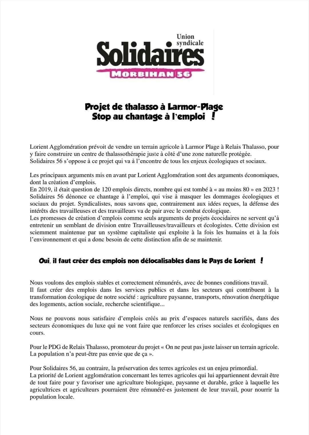 Projet de Thalasso à Larmor-Plage: Stop au chantage à l'emploi !