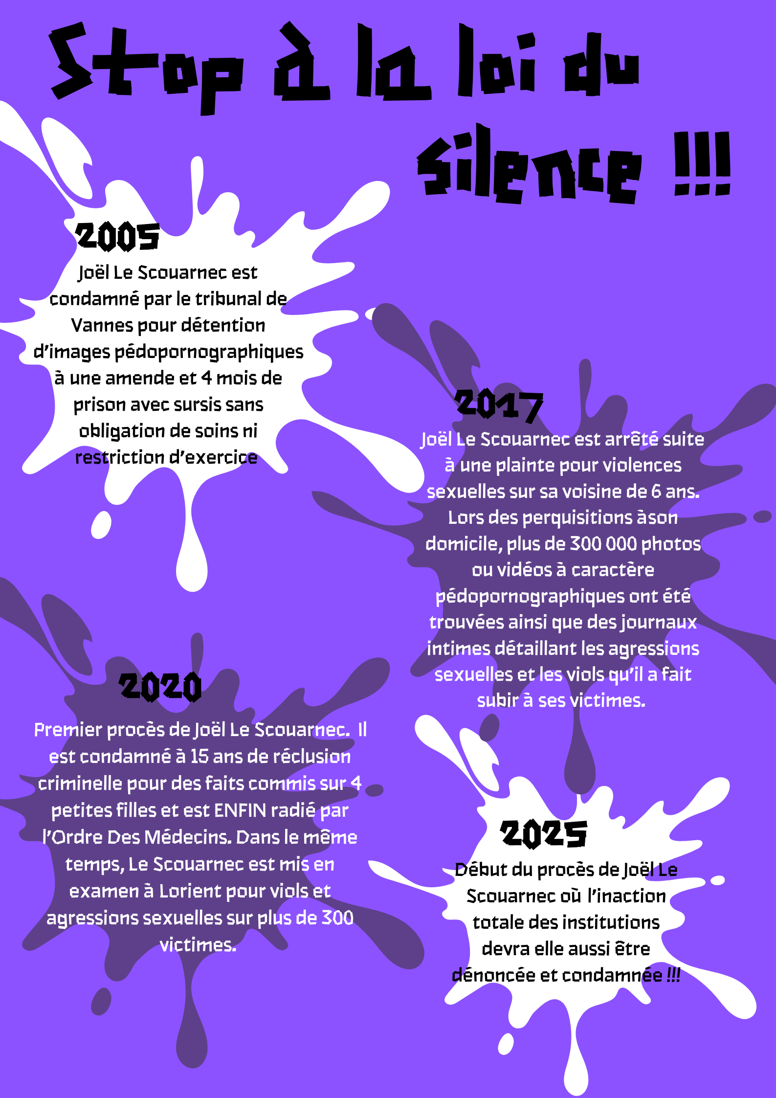 Joël Le Scouarnec, ex chirurgien, prédateur pédocriminel, sera jugé par la cour criminelle départementale du Morbihan, accusé de 300 viols et agressions sexuelles, pendant des années dans plusieurs hôpitaux du Morbihan, du Finistère, de l'Indre et Loire, de Charentes-Maritime et de Loire Atlantique, majoritairement sur des mineur·es de moins de 15 ans.