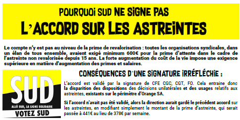 Même s’il n’est pas parfait, Sud PTT signe cet accord car cela va permettre de couvrir les salariés ACO et maintenant les managers afin de respecter les temps de repos après intervention, ainsi qu’un meilleur rendu dans le forfait pour un appel en dehors des heures non ouvrables.