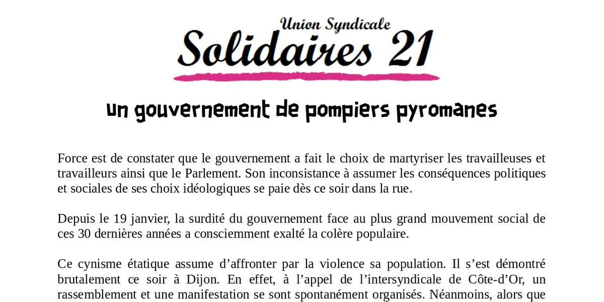Ce cynisme étatique assume d’affronter par la violence sa population. Il s’est démontré brutalement ce soir à Dijon. En effet, à l’appel de l’intersyndicale de Côte-d’Or, un rassemblement et une manifestation se sont spontanément organisés. Néanmoins, alors que tout se passait dans une belle ambiance collective, les forces de répression ont décidé de réprimer violemment à coup de gaz lacrymogène la manifestation.