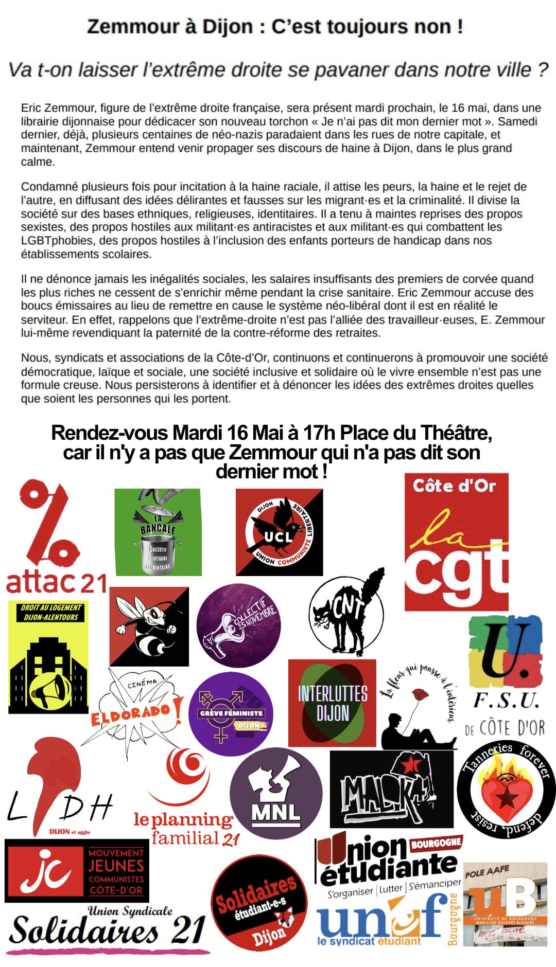 Nous, syndicats et associations de la Côte-d’Or, continuons et continuerons à promouvoir une société démocratique, laïque et sociale, une société inclusive et solidaire où le vivre ensemble n’est pas une formule creuse. Nous persisterons à identifier et à dénoncer les idées des extrêmes droites quelles que soient les personnes qui les portent.