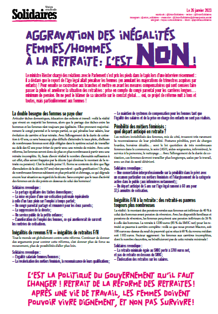 La réalité est là, persistante : selon l’INSEE (mars 2022) les femmes sont payées en moyenne 26 % de moins que les hommes dans le privé et 17 % dans la fonction publique. En 2020, la pension totale des femmes, réversion comprise, représente 71,7% de celle des hommes. C’est donc en amont qu’il faut agir, en traitant toutes les inégalités : bien des métiers féminisés sont dévalorisés, sous-rémunérés, invisibilisés (soins, métiers du social, éducation, nettoyage, commerce ...). Le gouvernement en reste aux constats en renvoyant à l’index des inégalités F/H mis en place en 2019, au lieu et place de mesures concrètes prises. Alors que l’augmentation des salaires des femmes au niveau de ceux des hommes apporterait 5,5 Mds€ au budget de la CNAV.