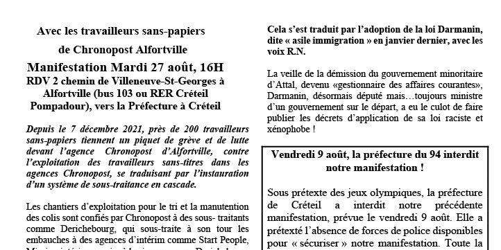 Communiqué de presse : le Vendredi 9 août, la préfecture du 94 interdit notre manifestation ! Sous prétexte des jeux olympiques, la préfecture de Créteil a interdit notre précédente manifestation, prévue le vendredi 9 août. Elle a prétexté l’absence de forces de police disponibles pour « sécuriser » notre manifestation. Toute la police du département (et du pays) semblait être mobilisée pour les J.O., bien qu’aucune épreuve n’ait lieu dans le Val-de-Marne… Pourtant, pour s’assurer du respect effectif de cette interdiction, la préfecture a déployé, sur le lieu de départ, prévu au RER Vert-de- Maisons, pas moins d’une cinquantaine de policiers en tenue, de nombreux véhicules, des personnels en civils…