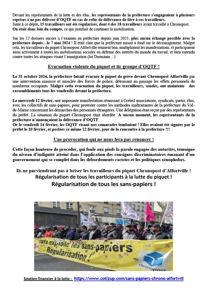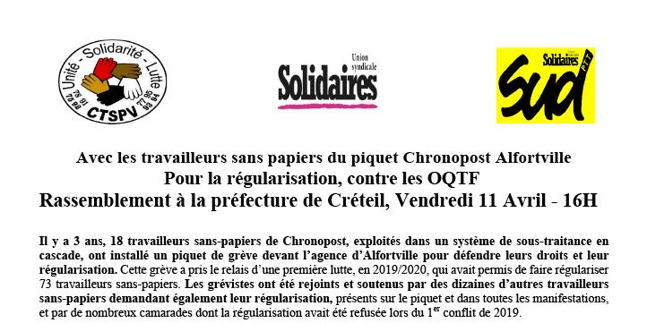 Avec les travailleurs sans papiers du piquet Chronopost Alfortville Pour la régularisation, contre les OQTF Rassemblement à la préfecture de Créteil, Vendredi 11 Avril - 16H