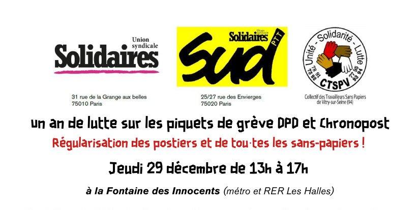 Cependant, aucune réponse n’a été donnée concernant les piquets des postiers sans-papiers de DPD et Chronopost, aucune réponse alors même que l’Etat est un actionnaire stratégique du donneur d’ordre qu’est La Poste. Malgré plusieurs manifestations et demandes d’audience, le ministère de l’intérieur n’a jamais reçu les représentants des grévistes de DPD et Chronopost, ni leurs soutiens syndicaux !