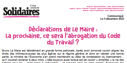L’Union syndicale Solidaires ne peut être que vent debout contre une telle ignominie si celle-ci venait à être inscrite comme le souhaite le cynique Le Maire dans une nouvelle loi Pacte en 2024 obsédé qu’il est d’aboutir au plein emploi de façade…au détriment de tous les salarié-es. .Ce n’est pas en cassant leurs droits et la justice du travail qu’on protège les salarié-es !