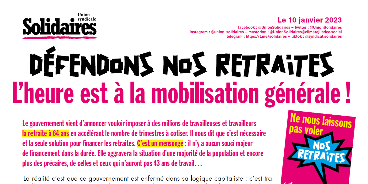 Le gouvernement vient d’annoncer vouloir imposer à des millions de travailleuses et travailleurs la retraite à 64 ans en accélérant le nombre de trimestres à cotiser. Il nous dit que c’est nécessaire et la seule solution pour financer les retraites. C’est un mensonge : il n’y a aucun souci majeur de financement dans la durée. Elle aggravera la situation d’une majorité de la population et encore plus des précaires, de celles et ceux qui n’auront pas 43 ans de travail…