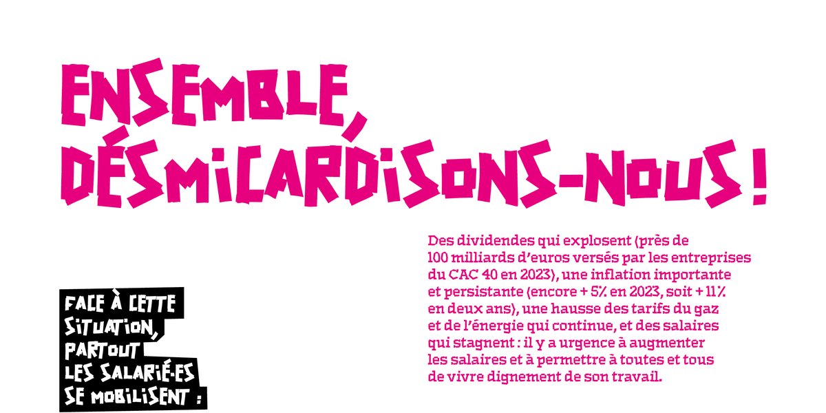 Des dividendes qui explosent (près de 100 milliards d’euros versés par les entreprises du CAC 40 en 2023), une inflation importante et persistante (encore + 5% en 2023, soit + 11% en deux ans), une hausse des tarifs du gaz et de l’énergie qui continue, et des salaires qui stagnent : il y a urgence à augmenter les salaires et à permettre à toutes et tous de vivre dignement de son travail.