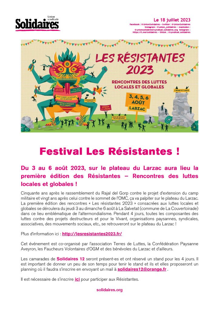 Cinquante ans après le rassemblement du Rajal del Gorp contre le projet d’extension du camp militaire et vingt ans après celui contre le sommet de l’OMC, ça va palpiter sur le plateau du Larzac. La première édition des rencontres « Les résistantes 2023 » consacrées aux luttes locales et globales se déroulera du jeudi 3 au dimanche 6 août à La Salvetat (commune de La Couvertoirade) dans ce lieu emblématique de l’altermondialisme. Pendant 4 jours, toutes les composantes des luttes contre des projets destructeurs et pour le Vivant, organisations paysannes, syndicales, associatives, des mouvements sociaux, etc., se retrouveront sur le plateau du Larzac !