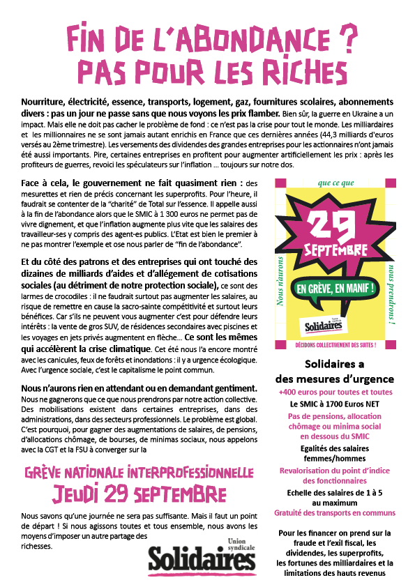 Face à cela, le gouvernement ne fait quasiment rien : des mesurettes et rien de précis concernant les superprofits. Pour l’heure, il faudrait se contenter de la “charité” de Total sur l’essence. Il appelle aussi à la fin de l’abondance alors que le SMIC à 1 300 euros ne permet pas de vivre dignement, et que l’inflation augmente plus vite que les salaires des travailleur-ses y compris des agent-es publics. L’Etat est bien le premier à ne pas montrer l’exemple et ose nous parler de “fin de l’abondance”.