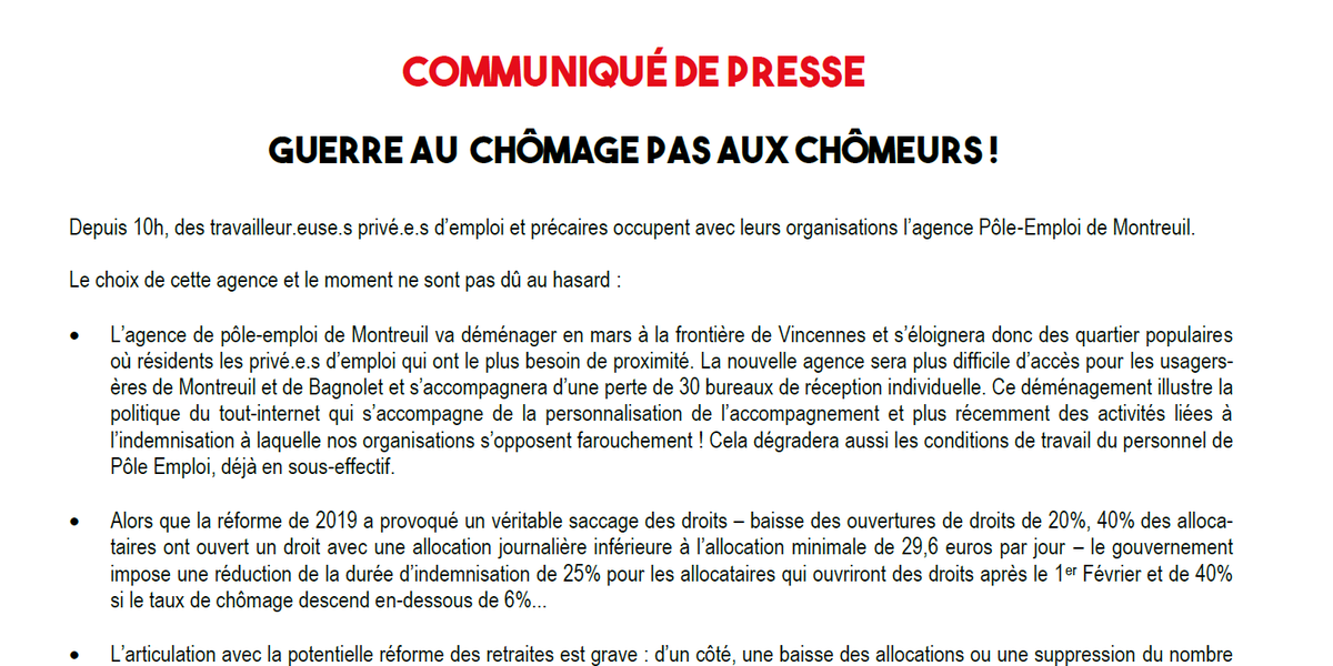 Nous appelons l’ensemble des travailleur.euse.s à rejoindre les privé.e.s d’emploi et précaires en lutte en se rendant à l’agence située au 7 Rue Kléber à Montreuil.