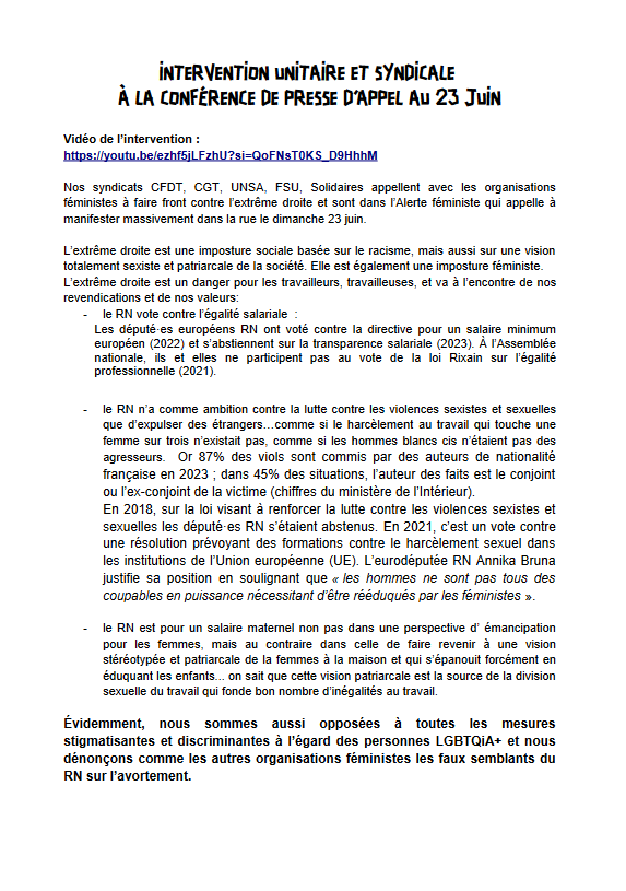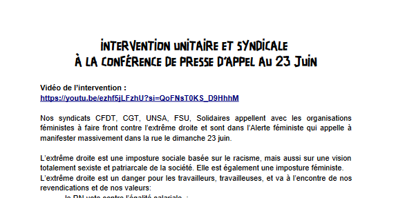 Nos syndicats CFDT, CGT, UNSA, FSU, Solidaires appellent avec les organisations féministes à faire front contre l’extrême droite et sont dans l’Alerte féministe qui appelle à manifester massivement dans la rue le dimanche 23 juin.