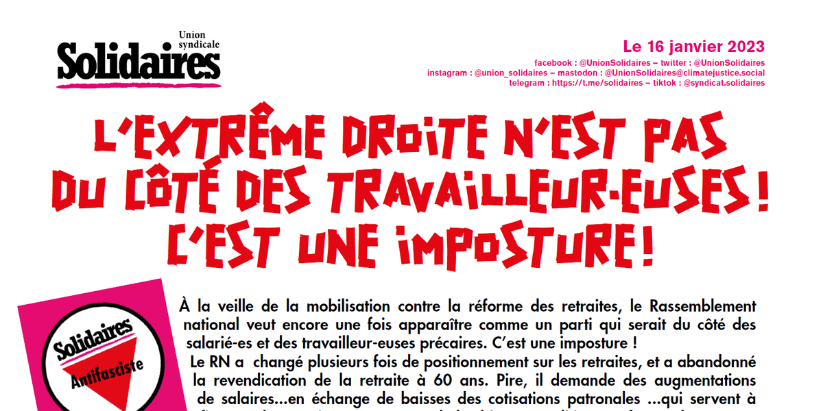 À la veille de la mobilisation contre la réforme des retraites, le Rassemblement national veut encore une fois apparaître comme un parti qui serait du côté des salarié-es et des travailleur-euses précaires. Ce tract rappelle que c’est une imposture !