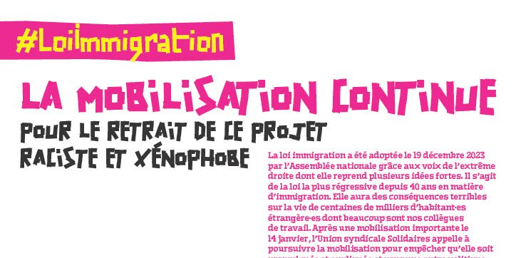 La loi immigration a été adoptée le 19 décembre 2023 par l’Assemblée nationale grâce aux voix de l’extrême-droite dont elle reprend plusieurs idées fortes. Il s’agit de la loi la plus régressive depuis 40 ans en matière d’immigration. Elle aura des conséquences terribles sur la vie de centaines de milliers d’habitant·es étrangère·es dont beaucoup sont nos collègues de travail. Après une mobilisation importante le 14 janvier, l’Union syndicale Solidaires appelle à poursuivre la mobilisation pour empêcher qu’elle soit promulguée et appliquée et pour une autre politique migratoire d’accueil.